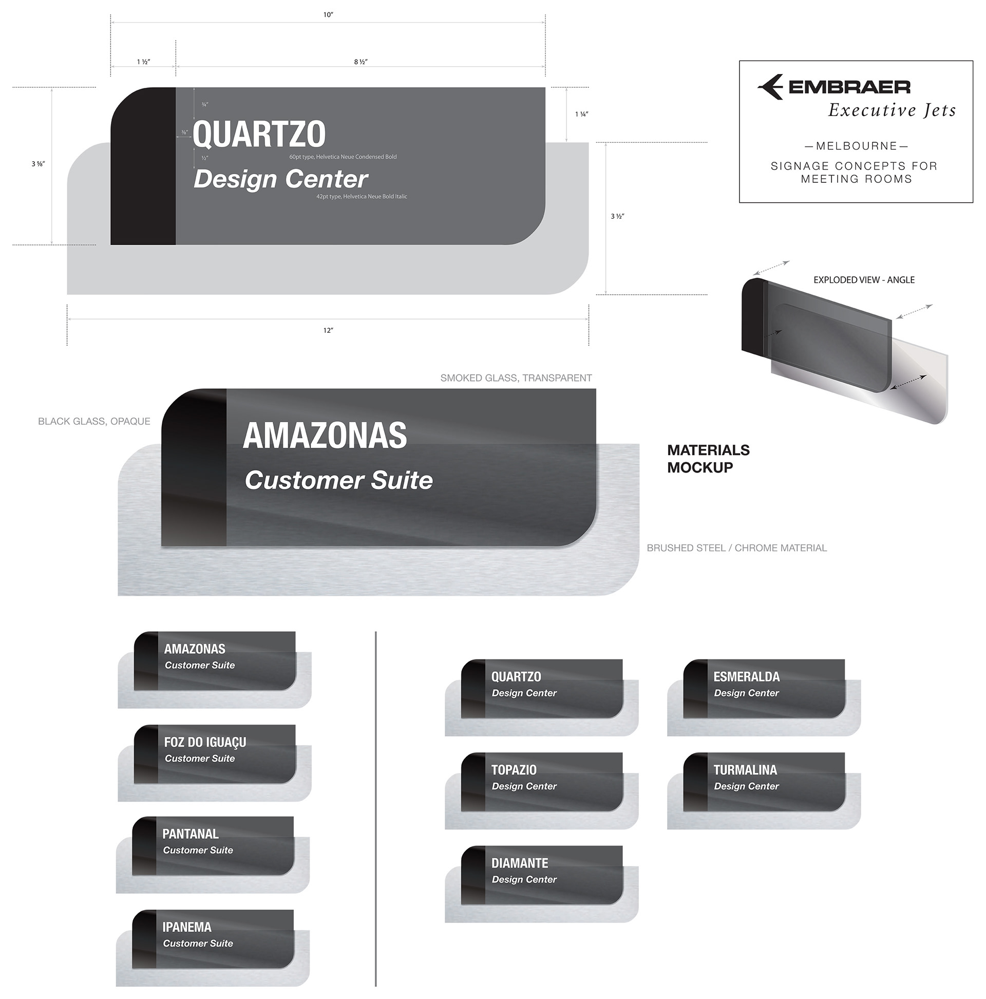 Meeting room signage for Embraer Executive Jets Customer Center. Each meeting room represents a specific gemstone, mineral or location in Brazil.
