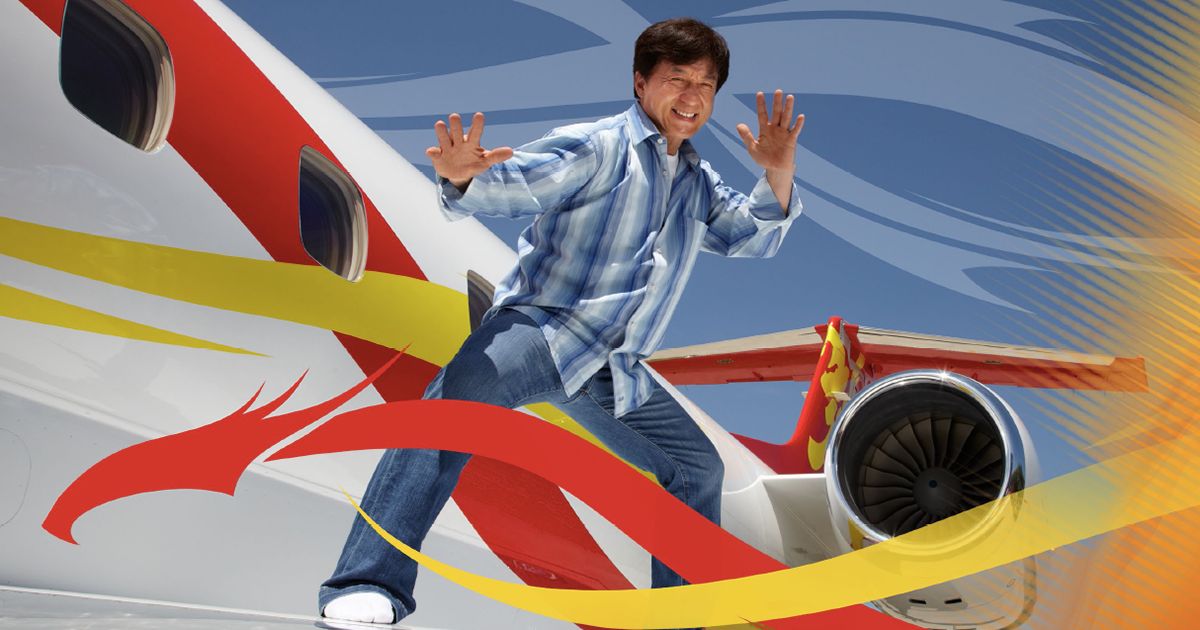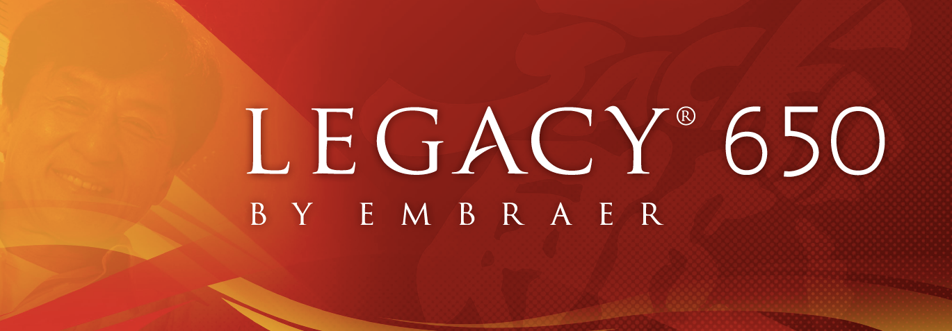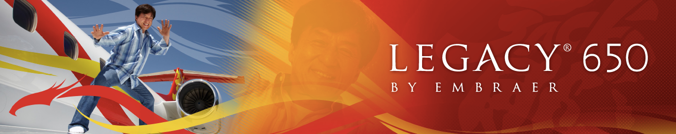 Trade Show Banner for Zhuhai Airshow 2014. Featuring Jackie Chan—celebrity spokesperson for Embraer Executive Jets—and his Legacy 650 Executive Jet.